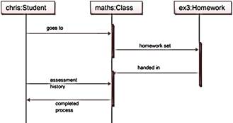 § The classes go along the top of the diagram, with a dotted line underneath it which shows how long that object is said to exist, called it’s lifeline. Where the dotted lines sometimes turn into thin boxes is where the classes methods have been called to do something.