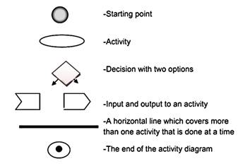 § It starts with a shaded in circle to show the initial state before anything has happened. Arrows are used to show the flow of activity to different outcomes for the object as it goes through the system